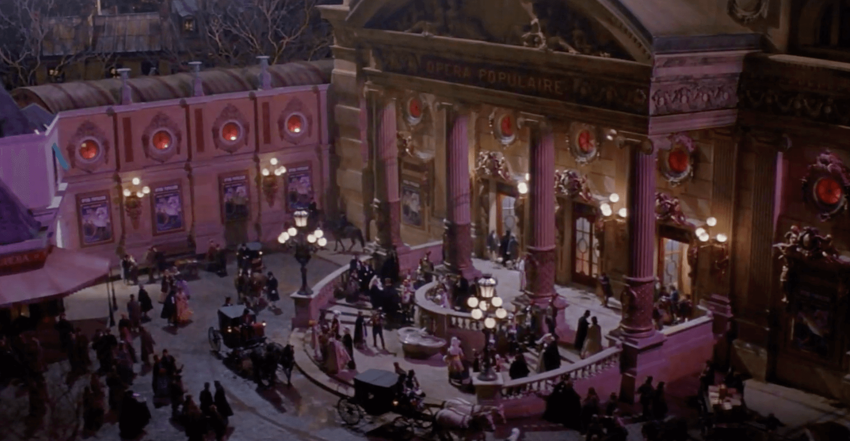 영화라는 매체의 특성을 살려 파리 오페라 극장을 웅장하게 재현했습니다. 뮤지컬이 무대 위에서 제한적인 공간을 활용해야 했다면, 영화에서는 카메라 워크와 세트 디자인을 통해 실제 오페라 극장의 화려함과 규모감을 사실적으로 표현했습니다. 팬텀의 지하 은신처는 영화에서 더욱 사실적이고 어둡게 묘사됩니다.